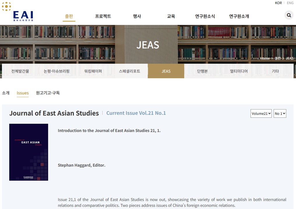 동아시아연구원(EAI: East Asia Institute)에서 발간하는 Journal of East Asian Studies는 동아시아 지역의 정치, 외교안보, 경제 등의 이슈를 다루는 학술지입니다. 연 3회 발간으로 3월에 1호, 7월에 2호, 11월에 3호가 발간됩니다.