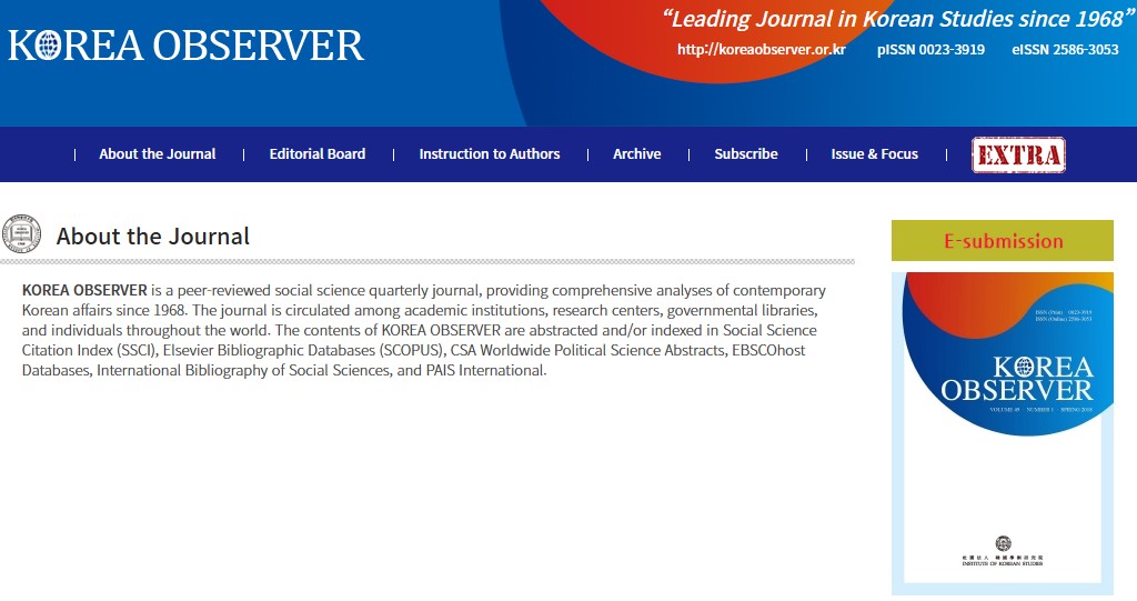 한국학술연구원(Institute of Korean Studies)에서 발간하는 Korea Observer는 위의 학술지들과는 다르게 "정치학"분야의 학술지라고 보기는 어렵습니다. 한국을 연구하는 사회과학 및 인문학 연구가 모두를 포함하는 학술지라고 할 수 있죠. 물론 정치학 분야에서도 상당히 많은 연구가 이 학술지에서 발표됩니다. 계간지로 3월, 6월, 9월, 12월에 발간됩니다.